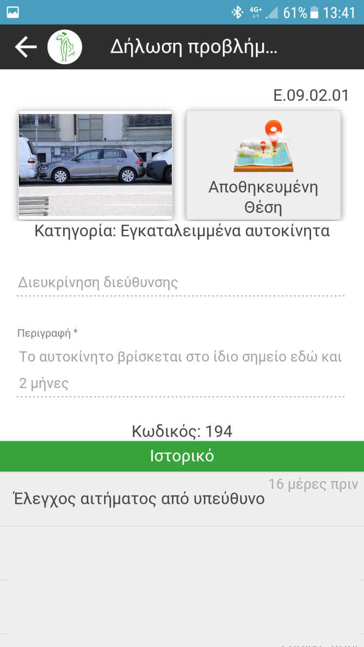 Κατηγορία, Περιγραφή, Φωτογραφία, Τοποθεσία. Η δήλωση γίνεται επιτόπου ή αν δεν υπάρχει δίκτυο αποθηκεύονται και υποβάλλονται σε επόμενη φάση. Προβολή κατάστασης υποβληθέντων.